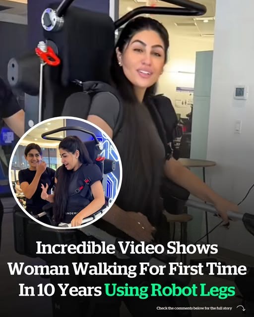 An incredible video shared on social media shows a woman walking for the first time in 10 years, with the help of advanced robotic technology.