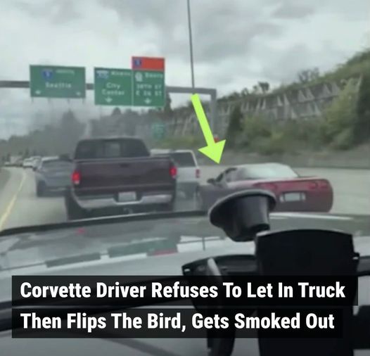 The video shows the truck driver trying to merge into an exit lane off the highway, but the red Corvette driver ensures that this doesn’t happen. The Corvette driver refuses to let the truck driver merge, then rolls down his window and flips him the bird.