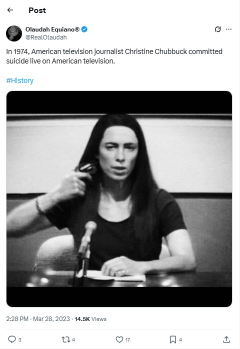 On July 15, 1974, Christine Chubbuck, a 29-year-old news anchor for WXLT-TV in Sarasota, Florida, tragically took her own life during a live broadcast of her morning show, Suncoast Digest. After delivering several news stories, she attempted to introduce a segment on a local shooting.