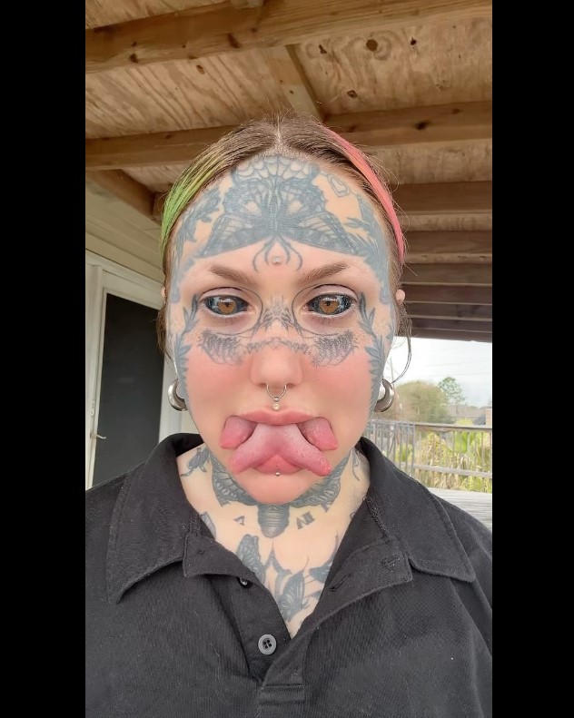 Her journey began at the age of 14 with her first tattoo. Since then, she has undergone extensive modifications, including tattooing the whites of her eyes, splitting her tongue to resemble a snake, and even implanting a design in her hand. These alterations have sparked a range of reactions online, with some individuals referring to her as a “demon” and expressing shock at her transformation.