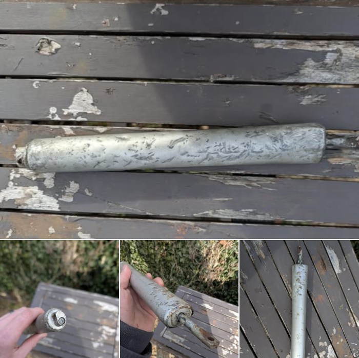 One morning, I spotted something shiny in my driveway. At first glance, it looked unusual: a metal cylinder about 1.5 feet long and 6 inches in diameter, with a mounting hole on one end and a piston rod with a bracket on the other. Rust streaks and scratches marked its base.