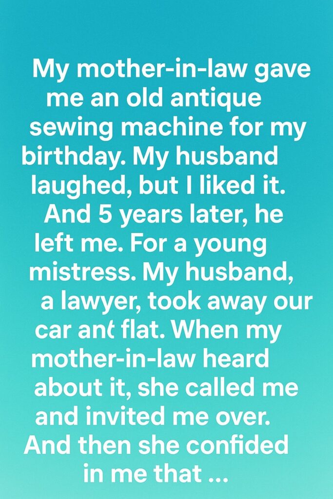 My mother-in-law gave me an old antique sewing machine for my birthday. My husband laughed, but I liked it. And 5 years later, he left me. For a young mistress. My husband, a lawyer, took away our car and flat. When my mother-in-law heard about it, she called me and invited me over. And then she confided in me tha. She had always known her son carried a streak of arrogance he’d inherited from no one but himself. As she poured tea into two delicate cups, she admitted she’d given me the sewing machine because she sensed I would one day need something of my own—a thing untouched by her son’s pride or the cold entitlement that came with his profession. Inside the machine, she said with a trembling smile, was a hidden drawer. And inside that drawer lay a small velvet pouch. It wasn’t money or jewelry, but something stranger: a collection of handwritten patterns her own mother had designed—a set of rare vintage templates rumored among collectors to be worth more than most modern machines combined.